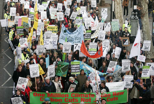 CARBON CUTS: Environmentalists hold banners in London on December 3, 2011, calling for drastic cuts in global greenhouse gas emissions (XINHUA)