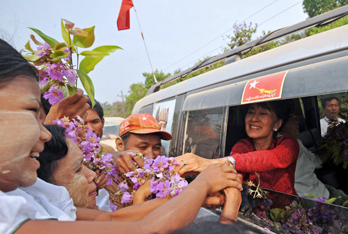 POPULARITY: Opposition leader Aung San Suu Kyi greets supporters during her election campaign in Kawhmu, Yangon Region, on April 1 (XINHUA/AFP) |