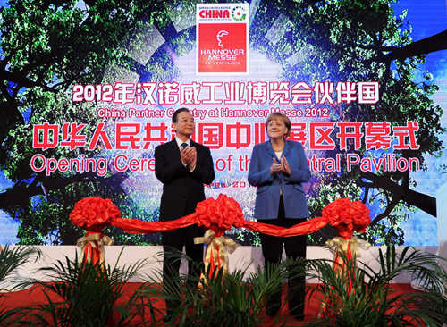 COMMON LINK: Chinese Premier Wen Jiabao and German Chancellor Angela Merkel attend the opening ceremony of the Chinese central pavilion at the Hannover Messe 2012 on April 23 in Hannover, Germany (RAO AIMIN)
