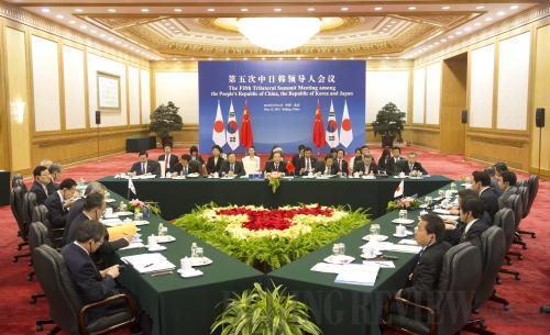 SUMMIT ASCENT: Officials from China, South Korea and Japan hold the Fifth Trilateral Summit Meeting in Beijing on May 13 (HUANG JINGWEN)