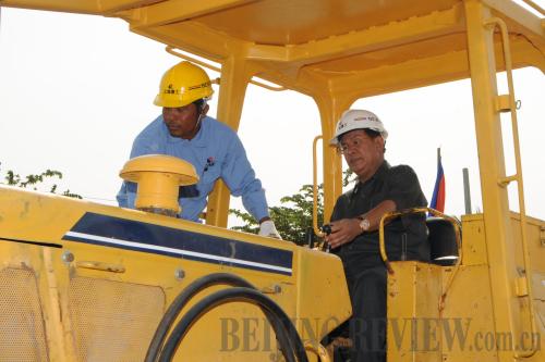 AID FOR DEVELOPMENT: Cambodian Prime Minister Hun Sen (right) drives a bulldozer at the groundbreaking ceremony of a road expansion project funded with a soft loan from China on the outskirts of Phnom Penh on February 14 (LEI BAISONG) |