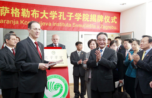 CULTURAL UNDERSTANDING: Wu Bangguo, Chairman of the Standing Committee of the National People's Congress, China's top legislature, attends the opening ceremony of the Confucius Institute of the University of Zagreb in Croatia on May 19 (JU PENG) |