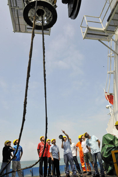 EXPEDITION: Crew members work on the Chinese research vessel Haiyang-6 in the South China Sea on June 4. The vessel set off two days earlier from south China's Guangzhou on a four-month ocean research program (ZHOU WENJIE)