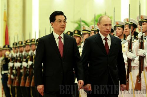 BILATERAL OCCASION: Chinese President Hu Jintao and his Russian counterpart Vladimir Putin review the guards of honor during a welcoming ceremony in Beijing on June 5. Putin arrived that day to attend the 12th SCO Summit and to pay a state visit to China (DING LIN)