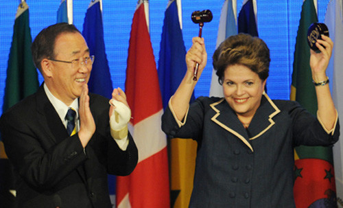 WRAPPING UP: UN Secretary General Ban Ki-moon and Brazilian President Dilma Rousseff at the closing ceremony of the Rio+20 UN Conference on Sustainable Development in Rio de Janeiro on June 22 (XINHUA/AFP) |