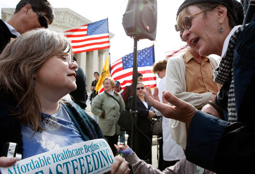 DISPUTES: Residents debate the ACA outside the Supreme Court in Washington, D.C. on March 28, the last day of hearings on the medical reform bill (FANG ZHE) |