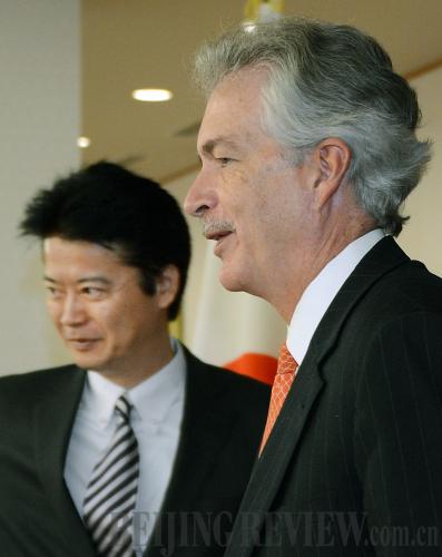 SEEKING INFLUENCE: U.S. Deputy Secretary of State William Burns (right) meets Japanese Foreign Minister Koichiro Gemba in Tokyo on October 15 during his Asia-Pacific trip (XINHUA/AFP) |