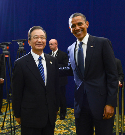 SUSTAINABLE TIES: Chinese Premier Wen Jiabao meets with U.S. President Barack Obama during the East Asia Summit in Phnom Penh, Cambodia, on November 20, shortly after Obama won a second term (MA ZHANCHENG) |