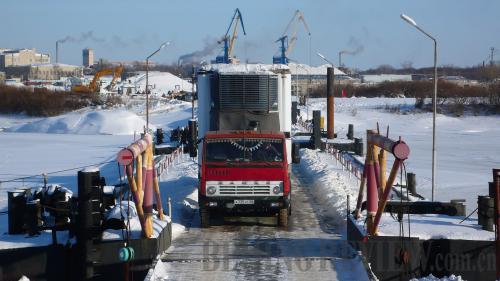 A BRIDGE LINKING NEIGHBORS: A Russian container truck drives over the icy surface of a 614-meter-long and 13-meter-wide frozen river passageway connecting Russia's Blagoveshchensk and China's Heihe on December 11 (QIU QILONG) |