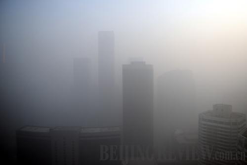FOGGY CITY: Guomao area near Beijing's Eastern 3rd Ring Road is enveloped with heavy smog on January 12 (LUO XIAOGUANG) |