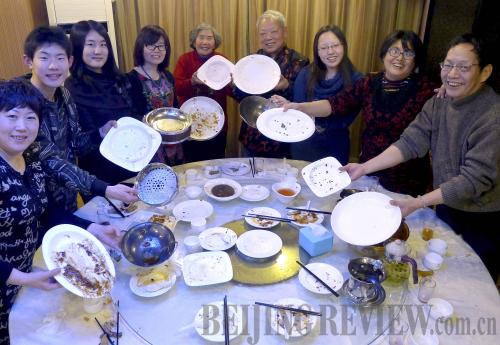 NO WASTE: A Beijing family shows clean plates after dining on the eve of the Chinese Lunar New Year on February 9 (XINHUA) |