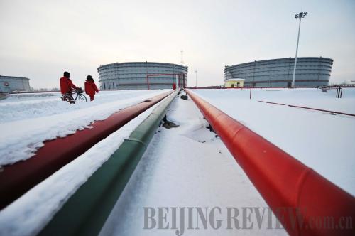 ENERGY LINE: Two Chinese workers patrol the China-Russia oil pipeline in Daqing, northeast China's Heilongjiang Province (WANG JIANWEI) |