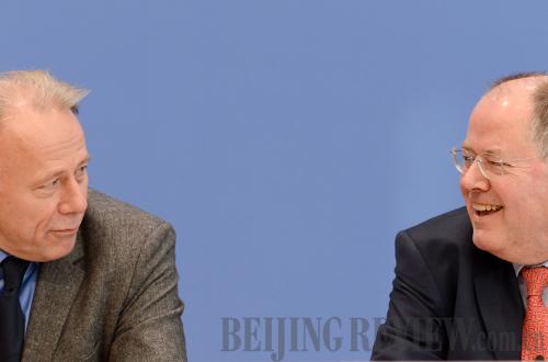 MERKEL'S CHALLENGERS: SPD's chancellor candidate Peer Steinbrück (right) and the Greens' top candidate Jürgen Trittin jointly attend a press conference in Berlin on December 12, 2012 (MA NING)