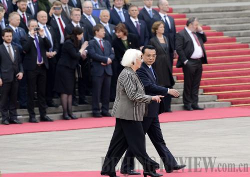 MARCHING ONWARD: Chinese Premier Li Keqiang welcomes Icelandic Prime Minister Johanna Sigurdardottir to Beijing on April 15 (CNSPHOTO) |