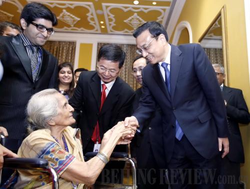 DEEP FRIENDSHIP: Chinese Premier Li Keqiang meets with Manorama, sister of Dr. Dwarkanath Kotnis who died in China while providing medical aid during World War II, in Mumbai on May 21. The Indian physician provided medical aid to China during World War II (JU PENG) |