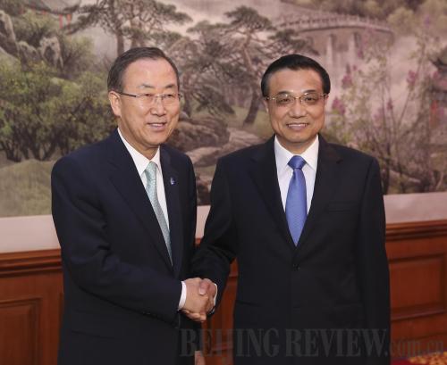 GLOBAL STRENGTH: Chinese Premier Li Keqiang meets with UN Secretary General Ban Ki-moon in Beijing on June 20 (DING LIN) |