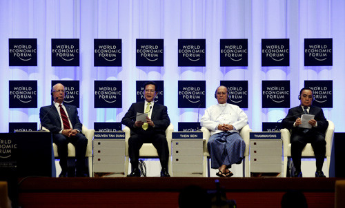 NETWORKED FUTURE: Chairman of the World Economic Forum Klaus Schwab, Vietnamese Prime Minister Nguyen Tan Dung, Myanmar's President U Thein Sein and Lao Prime Minister Thongsing Thammavong (left to right) attend the World Economic Forum on East Asia in Nay Pyi Taw on June 6 (XINHUA) |