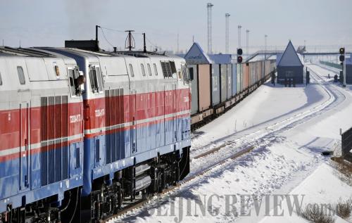 RAILWAY CONNECTION: A train passes through Horgos Port at the China-Kazakhstan border on December 22, 2012, the day when the second railway linking the two countries was put into service (ZHAO GE) |
