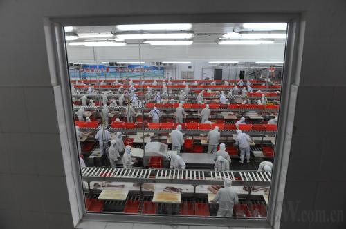 PRODUCTION POWER: Workers man a line at Shuanghui International Holdings Ltd. in Luohe, central China's Henan Province. Shuanghui, China's largest meat producer, offered to buy U.S. pork giant Smithfield Foods Inc. for $7.1 billion, including debt (ZHAO PENG) |