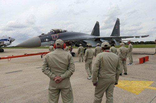 JET SETTERS: Engineers check a Russian Sukhoi SU-35 fighter jet at Le Bourget Airport, near Paris on June 20, during the 50th International Paris Air Show (XINHUA/REUTERS)
