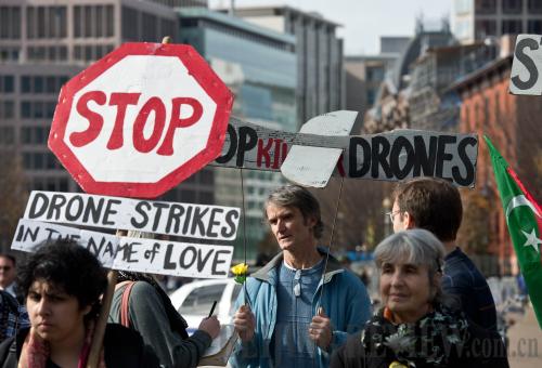 NO DRONES: Anti-war activists hold a rally against drone attacks in front of the White House in Washington, D.C. on November 15 ahead of the Global Drone Summit (XINHUA/AFP) |