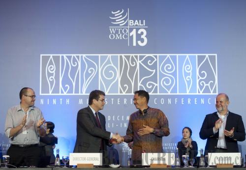 WTO Director General Roberto Azevedo (second left) and Gita Wirjawan (second right), Chairman of the Ninth WTO Ministerial Conference and Indonesia's Trade Minister, attend the closing ceremony of the conference in Bali, Indonesia, on December 7. The WTO sealed its first ever trade package at the meeting (LU XIAOWEI) |