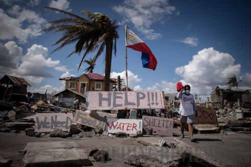 A typhoon survivor walks past signs pleading for help in a fishing village on the eastern Philippine island of Leyte on November 18, more than one week after Super Typhoon Haiyan devastated the area (XINHUA/AFP) |