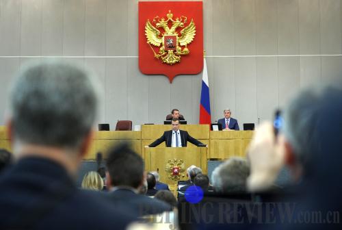SUPPORT FROM THE TOP: Prime Minister Dmitry Medvedev pledges to boost the development of Russia's Far East at the lower house of the Russian parliament in Moscow on April 17, 2013 (XINHUA/AFP) |