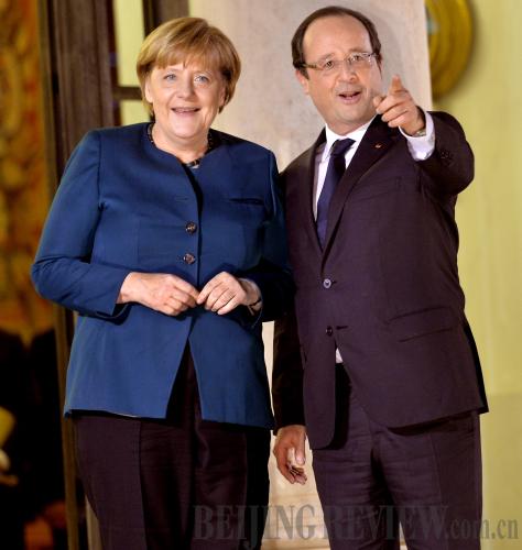 WORKING TOGETHER: French President Francois Hollande meets with newly reelected German Chancellor Angela Merkel during her visit to Paris on December 18, 2013 (CHEN XIAOWEI) |
