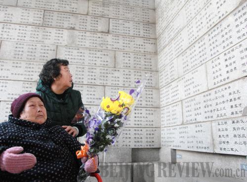 BITTER MEMORIES: Mei Shoulan (front), a survivor of the Nanjing Massacre, during which invading Japanese troops slaughtered more than 300,000 Chinese people, presents flowers in front of a wall of victims' names in Nanjing, east China's Jiangsu Province, on December 13, 2013 (XINHUA) |