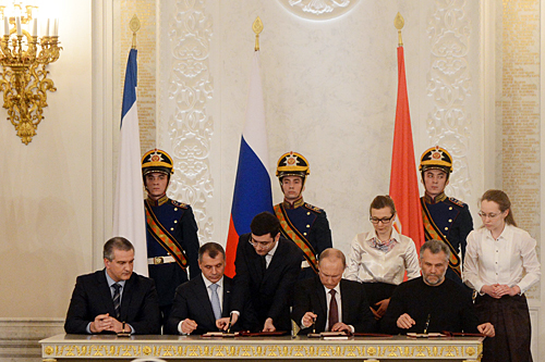 ACCESSION APPROVED: Leaders from Russia, Crimea and Sevastopol sign a treaty on the Crimean Peninsula becoming part of Russia in the Kremlin on March 18 (XINHUA/AFP) |