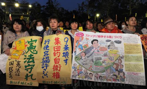 CALLS FOR PEACE: Demonstrators attend a rally in Tokyo on April 8 against government plans to soften Japan's constitutional commitment to pacifism and give its military a more active role (XINHUA/AFP) |