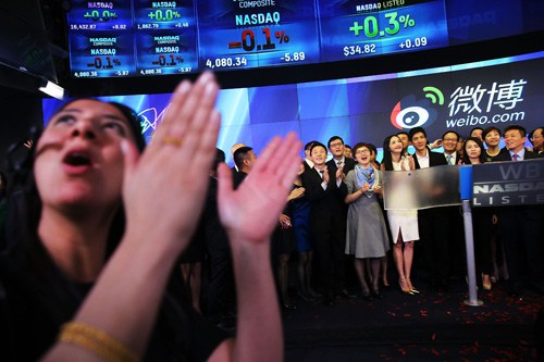 WELCOME ABOARD: People cheer as China's Weibo, a Twitter-like microblogging service company, begins trading on the Nasdaq exchange in New York City on April 17 (XINHUA/AFP) |