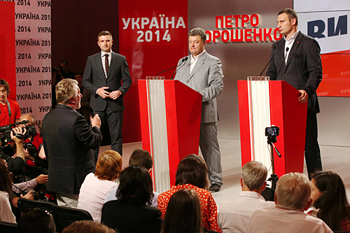 VICTORY: Ukrainian presidential candidate Petro Poroshenko (center) attends a press conference in Kiev on May 26. Preliminary official results put Poroshenko clearly ahead in the nation's presidential election (XINHUA) |
