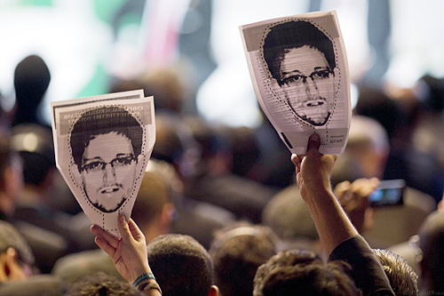 PRISM FALLOUT: Demonstrators hold portraits of U.S. whistleblower Edward Snowden in a protest during the opening ceremony of the Global Multistakeholder Meeting on the Future of Internet Governance on April 23 in Sao Paulo, Brazil (XINHUA/AFP) |