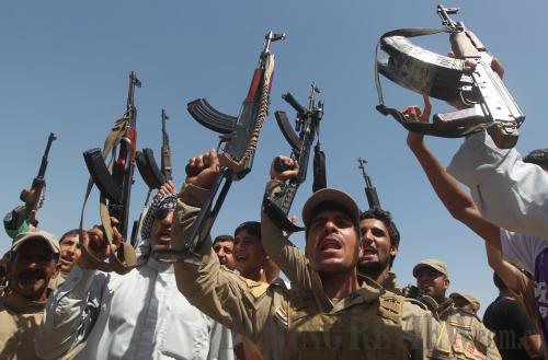 UP IN ARMS: Iraqi Shiite men raise their weapons as they gather in a town in Diyala Province on June 14, to show their determination to defend the country (XINHUA/AFP) |