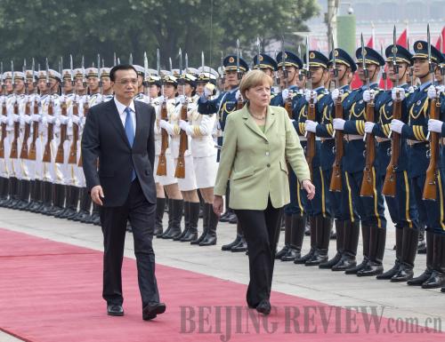 MEETING AN OLD FRIEND: Chinese Premier Li Keqiang holds a welcoming ceremony for German Chancellor Angela Merkel in Beijing on July 7 (PANG XINLEI) |