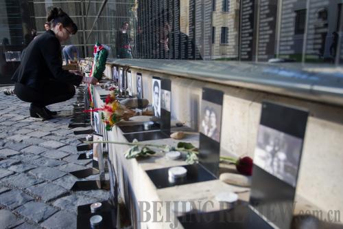 REMEMBRANCE OF TRAGEDY: A woman mourns for the more than half a million Hungarian Jews who were killed during the Nazi Holocaust in World War II at Budapest's Holocaust Memorial Center in Budapest, Hungary, on April 16, 2013 (XINHUA) |