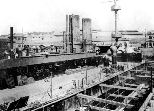 BROKEN SHIP: Zhenyuan, a ship from the Beiyang Fleet, is repaired at Lushun Port after the Chinese navy's defeat in the Battle of the Yalu River in 1894 (CFP) |