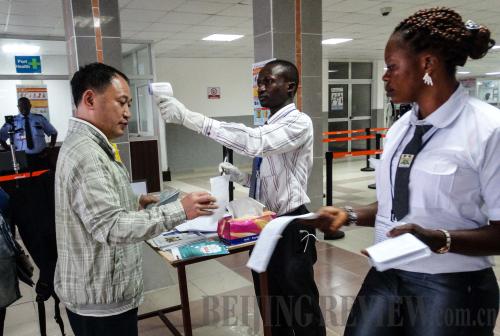DOCTORS NEEDED: A security officer measures the body temperature of Xu Daomiao, a Chinese medical expert who arrived at Freetown Lungi International Airport, Sierra Leone on August 17 (XINHUA) |