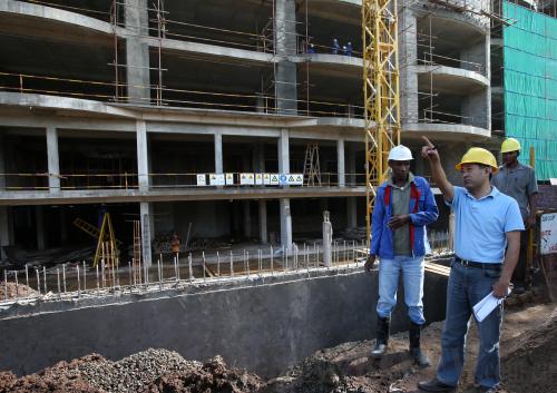 BUILDING TOGETHER: A Chinese project manager and local employees work at the construction site of a shopping mall in Moshi, Tanzania, on April 13, 2013 (XINHUA) |