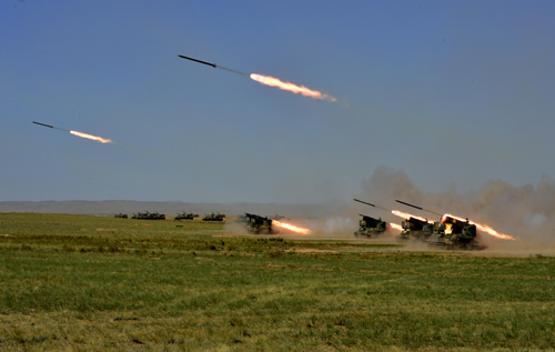 TEST FIRE: Chinese artillery troops shoot at targets on a training base in north China's Inner Mongolia Autonomous Region during the SCO Peace Mission 2014 joint antiterror drill on August 29 (SU XIANGDONG) |