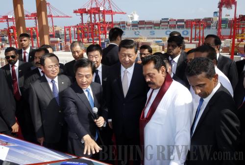 SYMBOL OF COOPERATION: Chinese President Xi Jinping (third right) and his Sri Lankan counterpart Mahinda Rajapaksa (second right) visit a China-invested container terminal in Colombo on September 17 (JU PENG) |