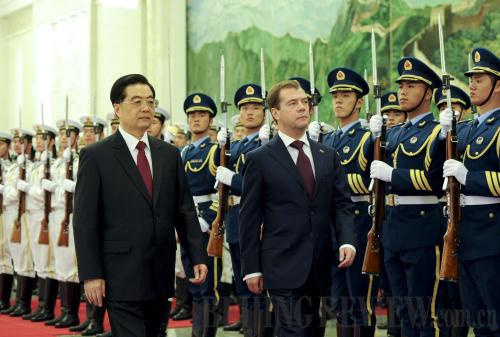 STATE GUEST: Chinese President Hu Jintao and his visiting Russian counterpart Dmitry Medvedev review honor guards at a welcoming ceremony in Beijing on September 27, 2012 (LI XUEREN) |