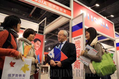 NEXT GENERATION: A Russian education official answers questions from Chinese students during an international education show in Beijing on November 2, 2013 (ZHANG YANHUI) |