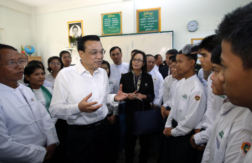MEETING YOUTHS: Chinese Premier Li Keqiang talks with Myanmar students during a visit to a middle school in Nay Pyi Taw, capital of Myanmar, on November 14 (JU PENG) |