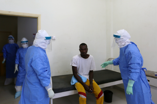 MEDICAL AID: Chinese doctors offer treatment to a suspected Ebola patient in China-Sierra Leone Friendship Hospital in Freetown on October 26 (HUANG XIANBIN) |
