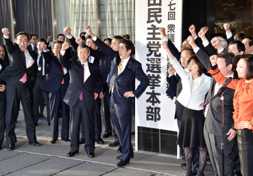 ELECTION CAMPAIGN: Japanese Prime Minister Shinzo Abe (center) shouts slogans with his Liberal Democratic Party's lawmakers at the party's headquarters in Tokyo on November 21, after he dissolved the lower house of the parliament (XINHUA/AFP) |