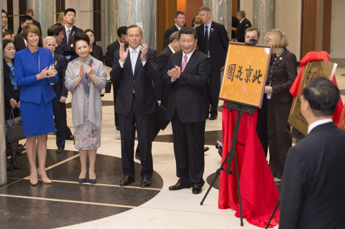 ENHANCING MUTUAL UNDERSTANDING: Visiting Chinese President Xi Jinping (right) and Australian Prime Minister Tony Abbott attend the unveiling ceremony for the Beijing Garden in Canberra, the Chinese culture center in Sydney and the Chinese library of the library of Sydney's University of Technology, in Canberra, on November 17 (MA ZHANCHENG) |