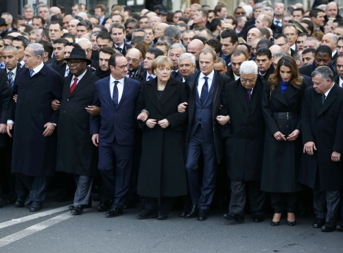 UNITY MARCH: French President Francois Hollande (fourth left) and dozens of foreign leaders join a massive march in Paris, France, on January 11 in honor of the victims killed in an attack on Charlie Hebdo magazine and a hostage-taking incident (CFP) |